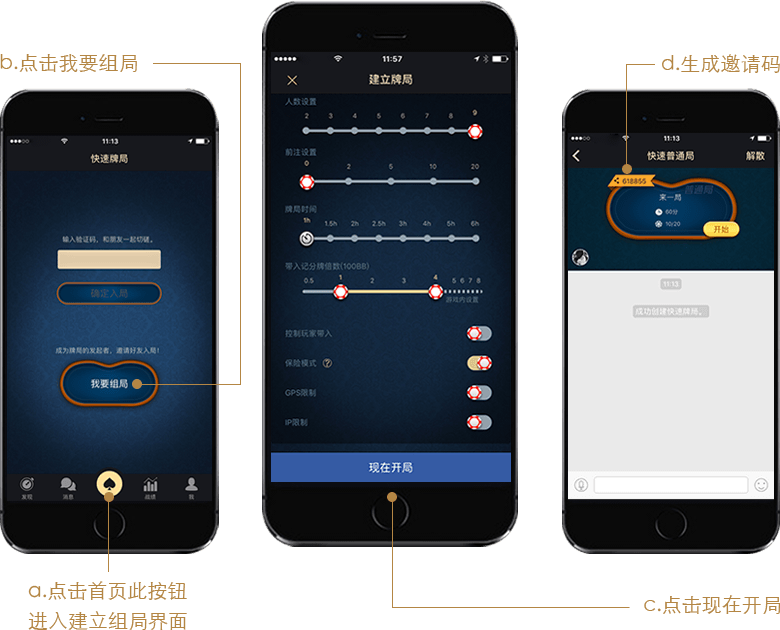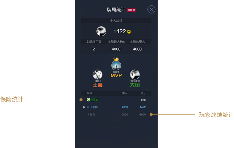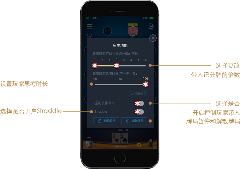 踢出牌局——使用此功能,在此轮手牌结束后,该玩家被踢出出局,出局后,玩家不可再次进入该牌局游戏。