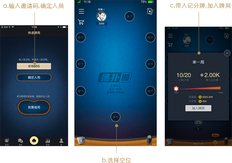 开启控制玩家买入后,玩家在牌桌上买入/补充筹瑪时,系统为房主发送消息,经房主确定玩家的请求后,玩家买入/补充筹瑪才会生效。若不开启控制玩家买入,则玩家在上桌时可自由买入/补充筹瑪。